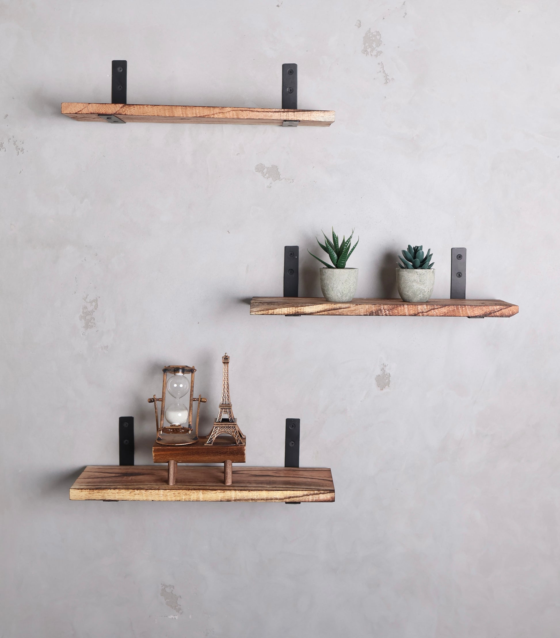 Rustic Appeal: The rustic design and weathered finish of these shelves bring a timeless, farmhouse-inspired charm to your living space. Whether you're decorating a cozy nook or a modern living room, these shelves effortlessly blend with various decor styles.
